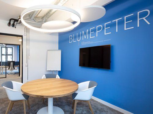 Individuelle Bürogestaltung Raum "Unterwasser" bestehend aus bedruckter Vliestapete und Glasdekorfolie