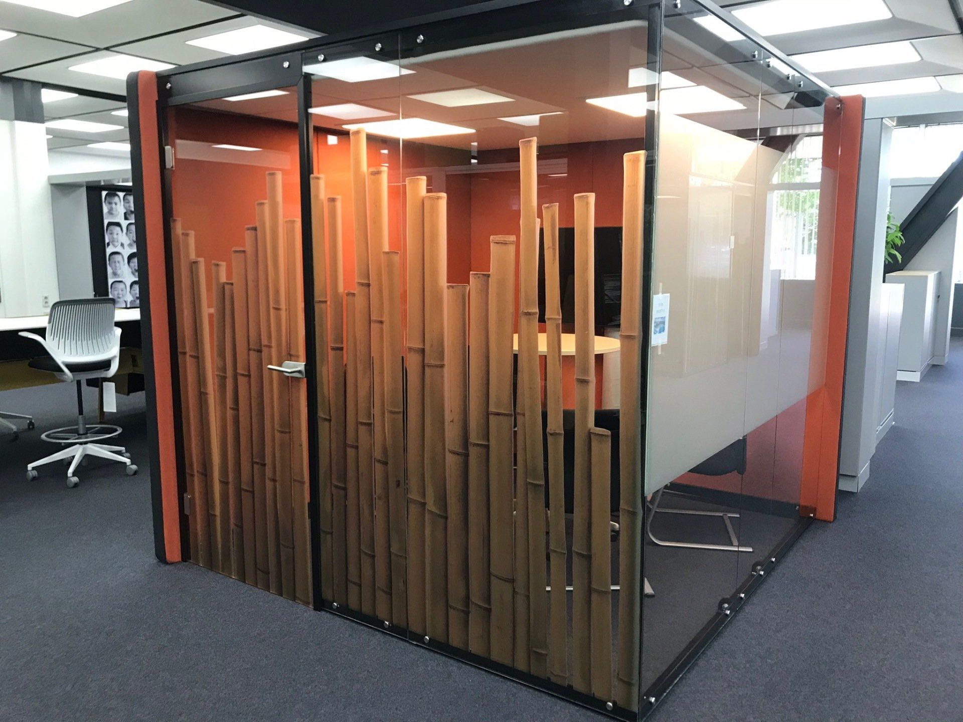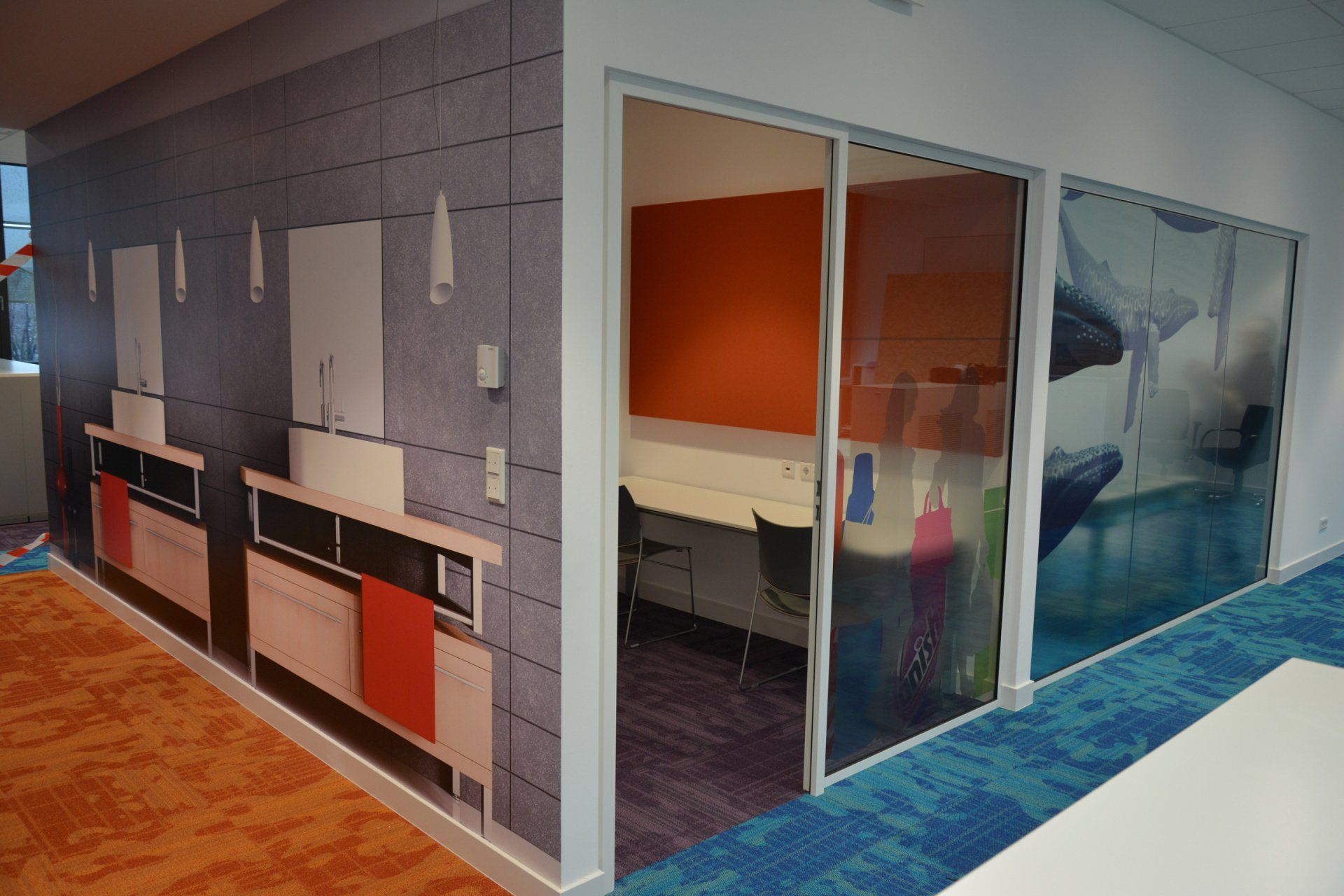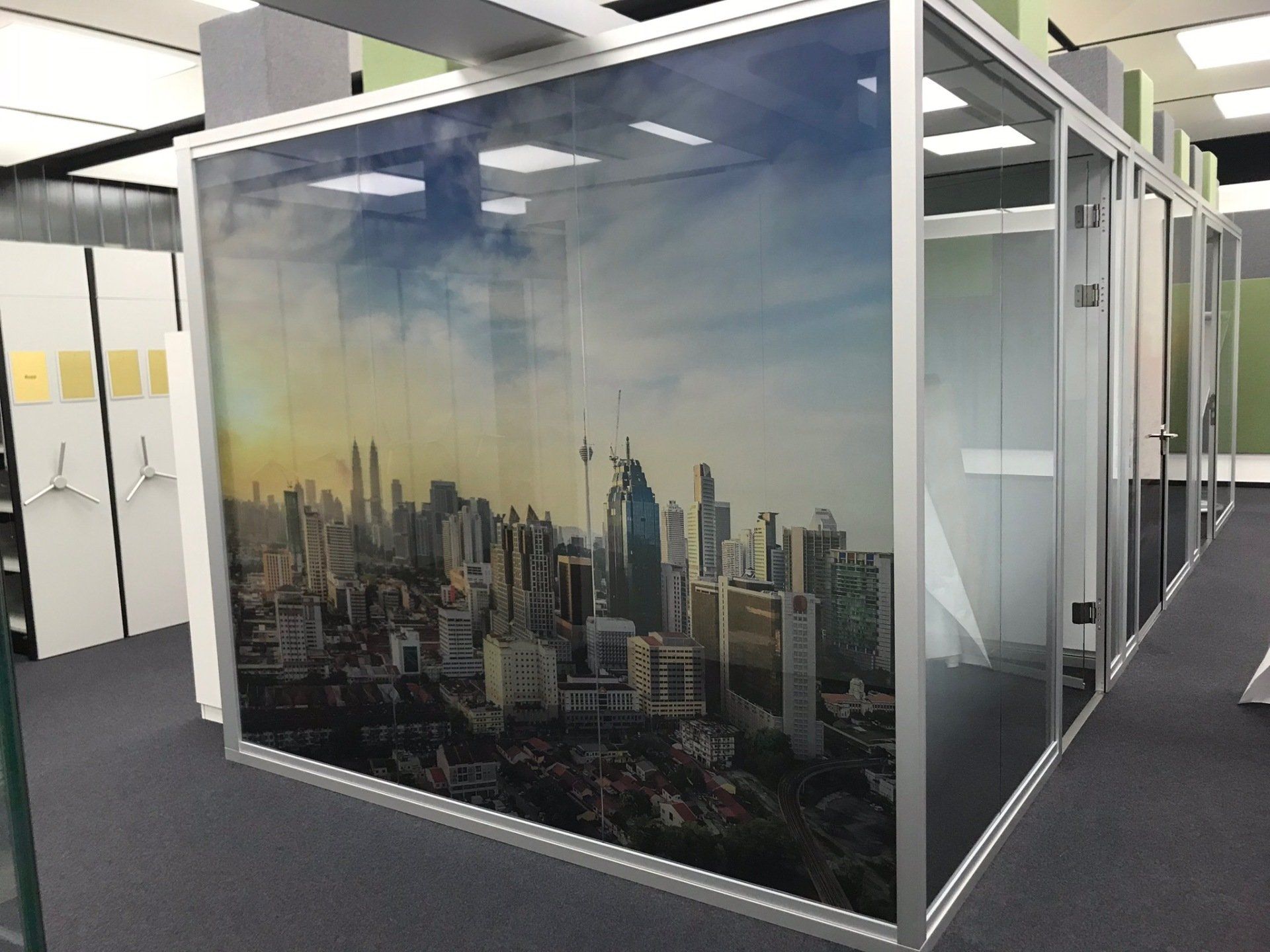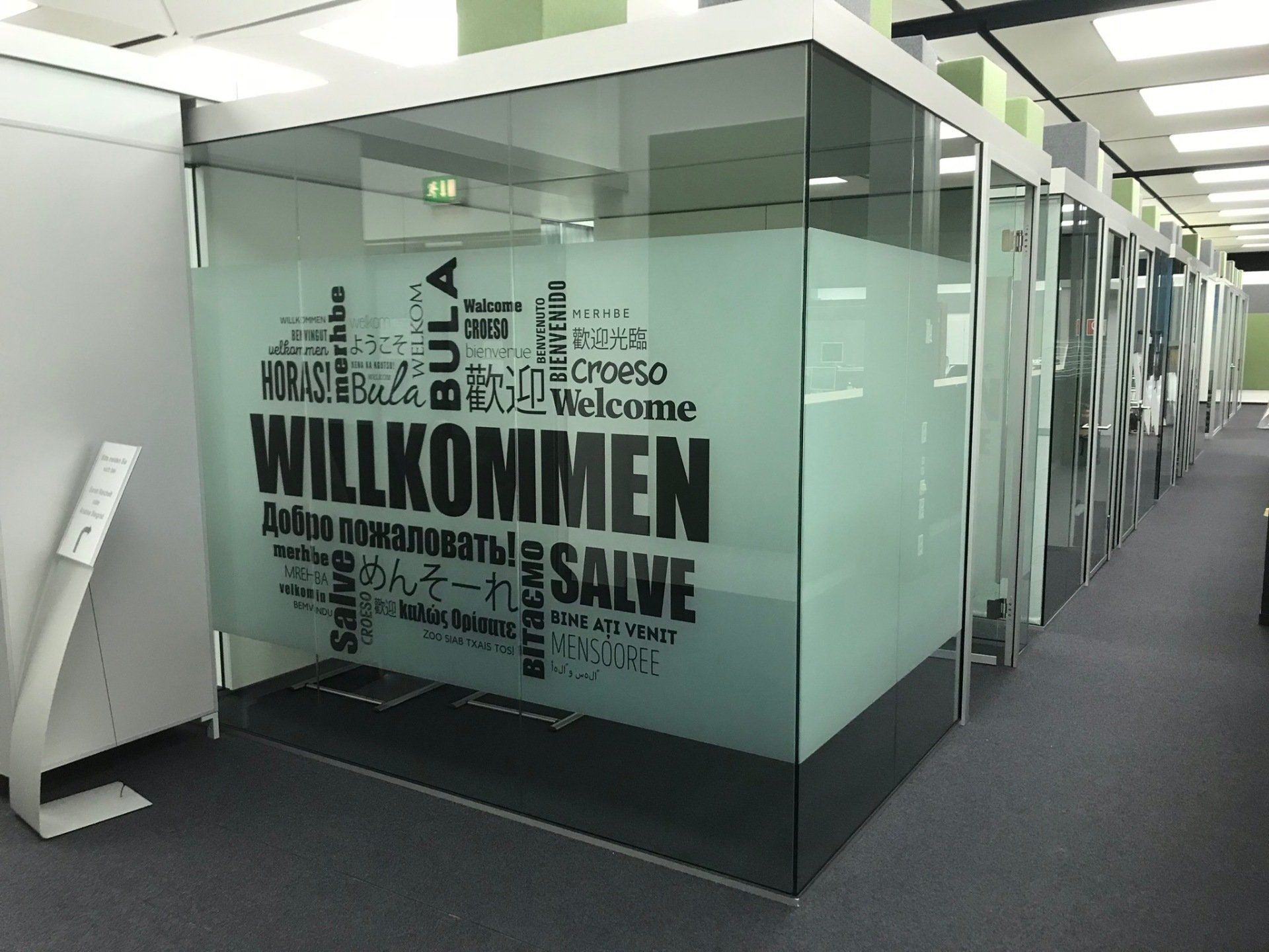 Individuelle Bürogestaltung bestehend aus bedruckter Vliestapete und Glasdekorfolie