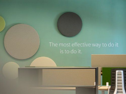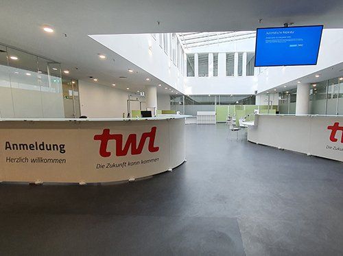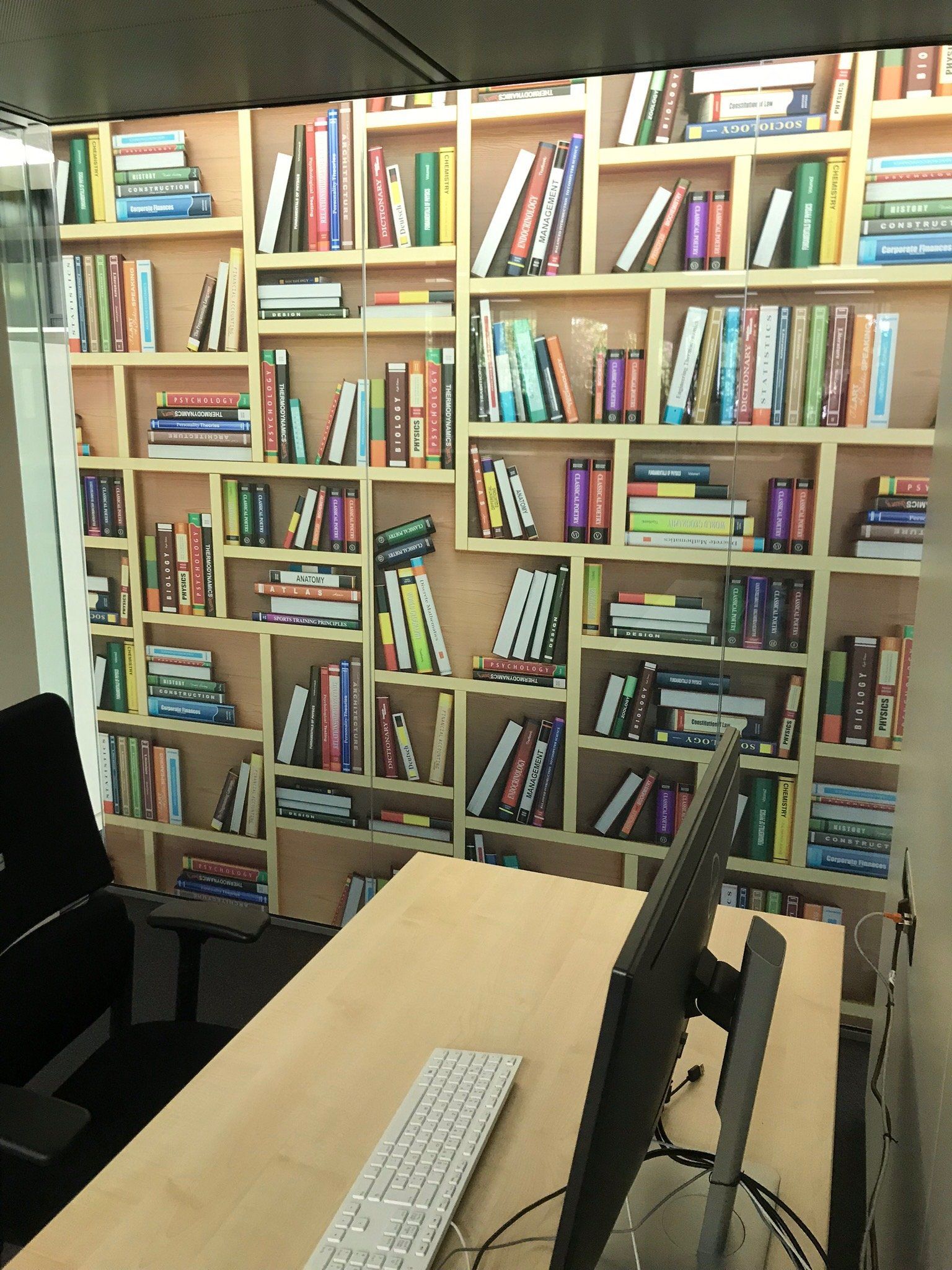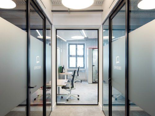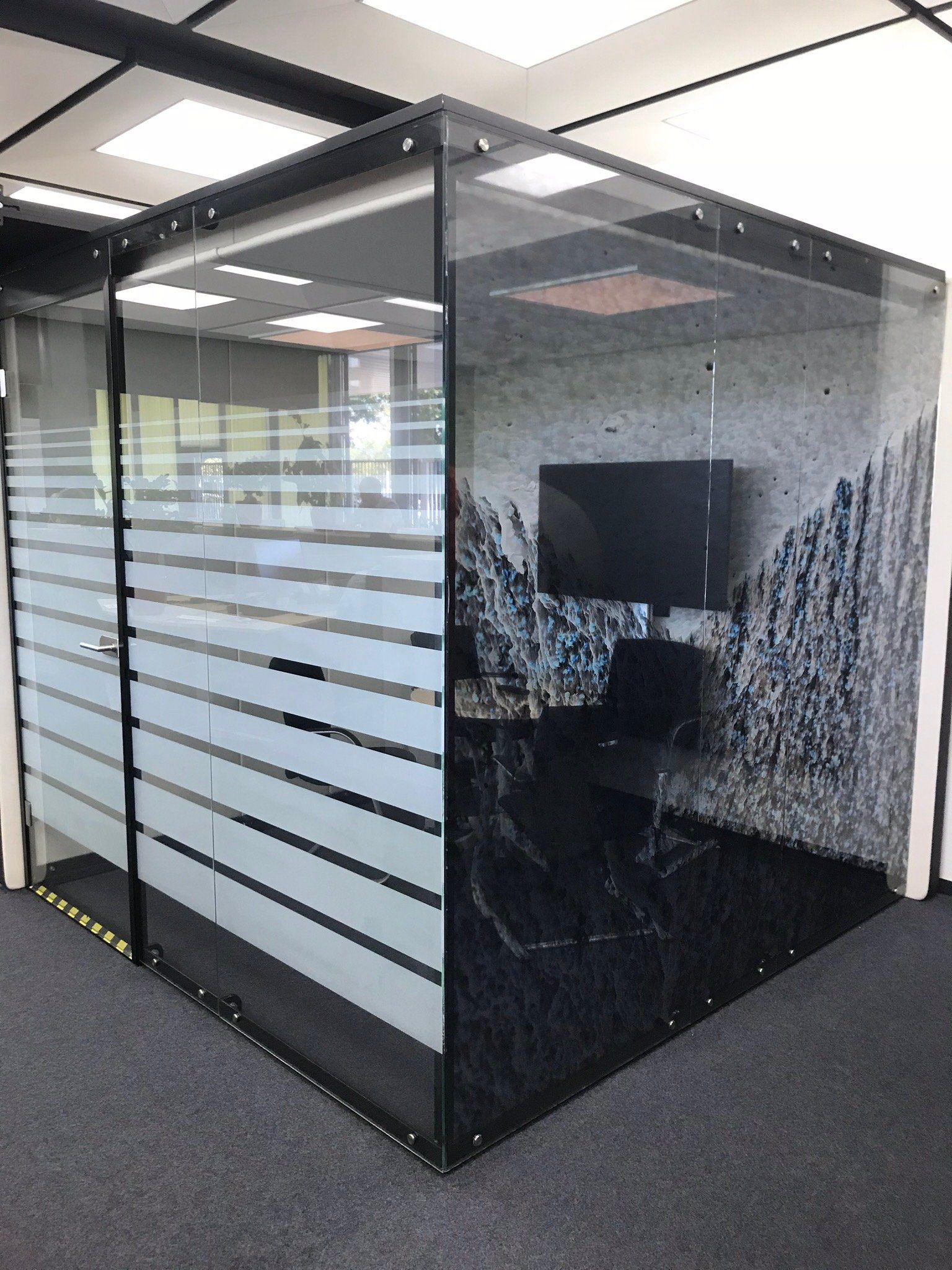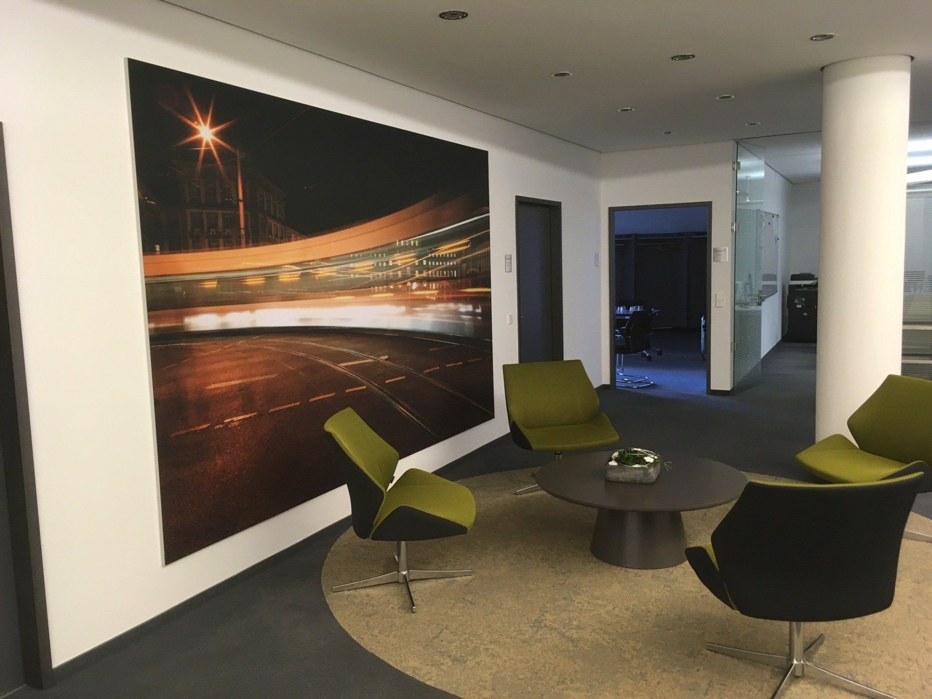Individuelle Bürogestaltung bestehend aus bedruckter Vliestapete und Glasdekorfolie