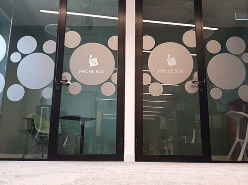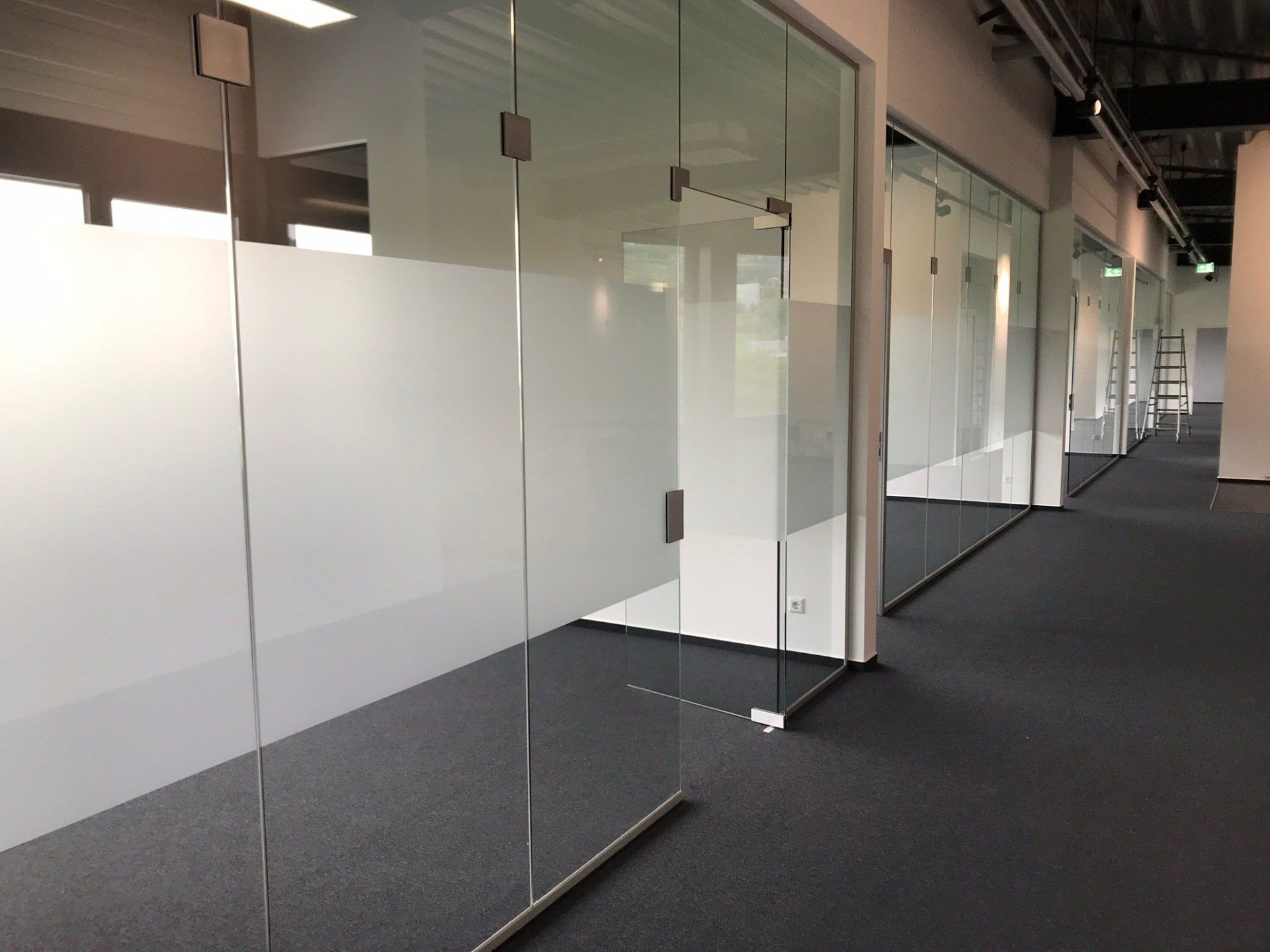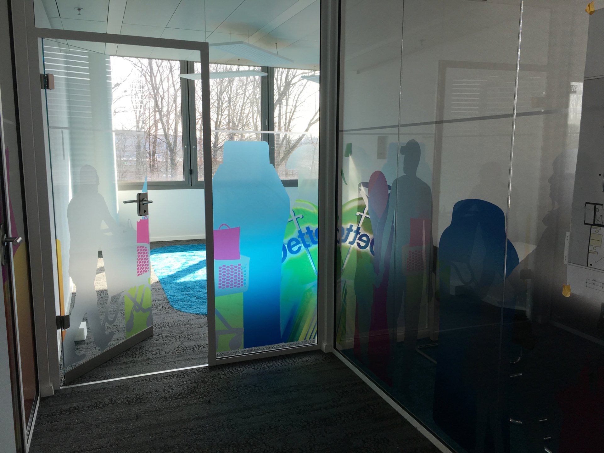 Sichtschutz aus milchiger Glasdekorfolie mit Logo