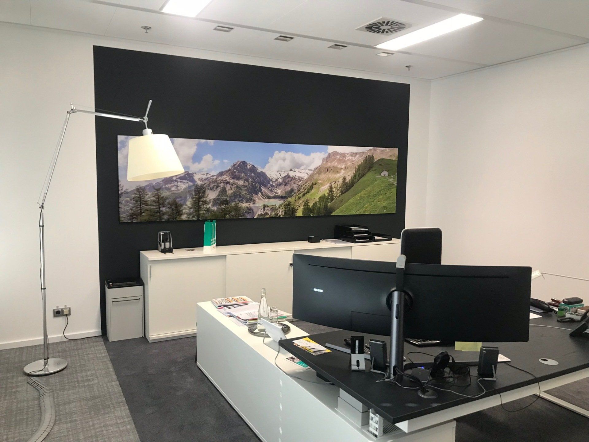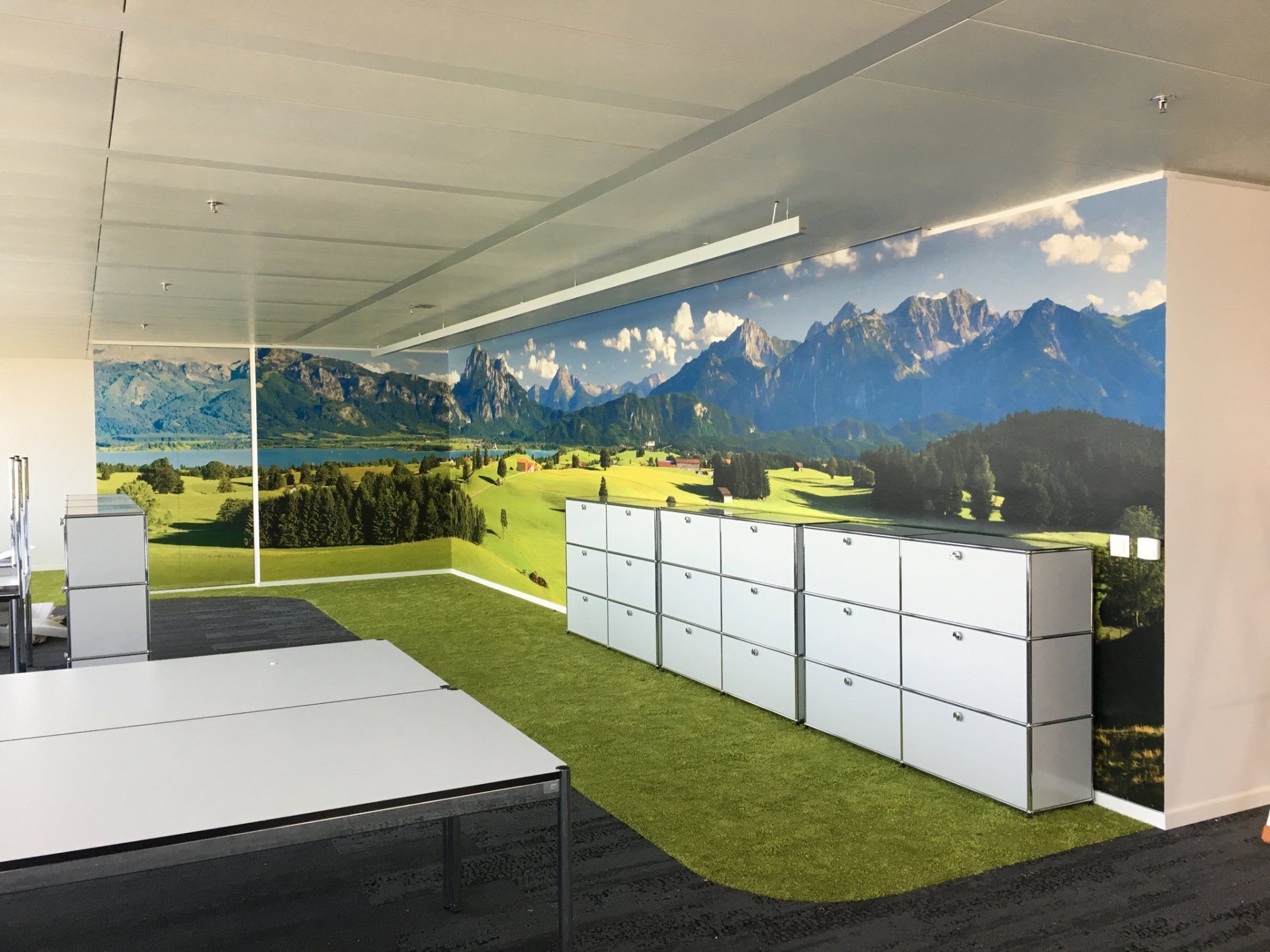 Individuelle Bürogestaltung Raum "Berglandchaft" bestehend aus bedruckter Vliestapete und Glasdekorfolie