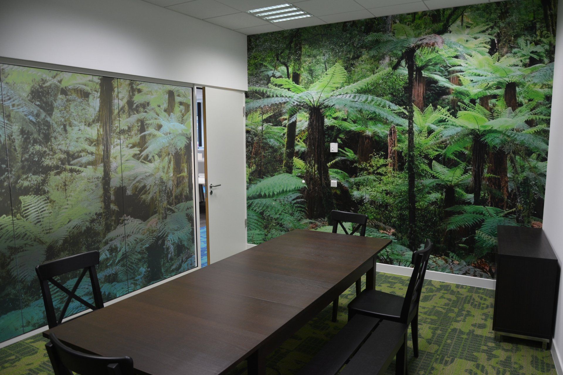 Individuelle Bürogestaltung Raum "Dschungel" bestehend aus bedruckter Vliestapete und Glasdekorfolie