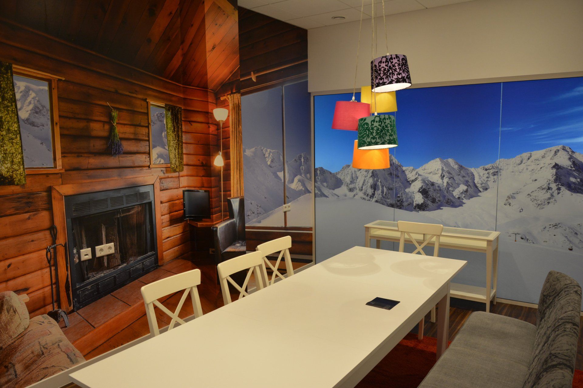 Individuelle Bürogestaltung Raum "Alpenhütte" bestehend aus bedruckter Vliestapete und Glasdekorfolie